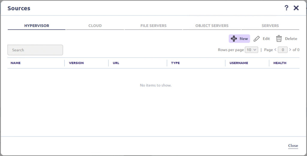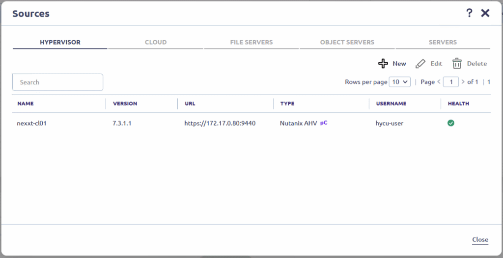 First source that we will add to Hycu is a hypervisor. So, go to the hypervisor panel and click ‘New’.