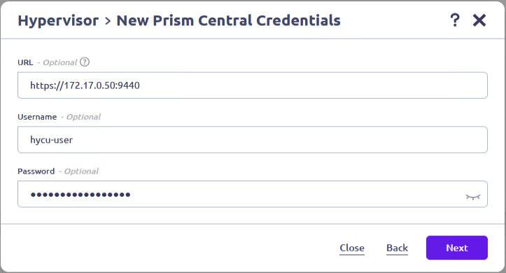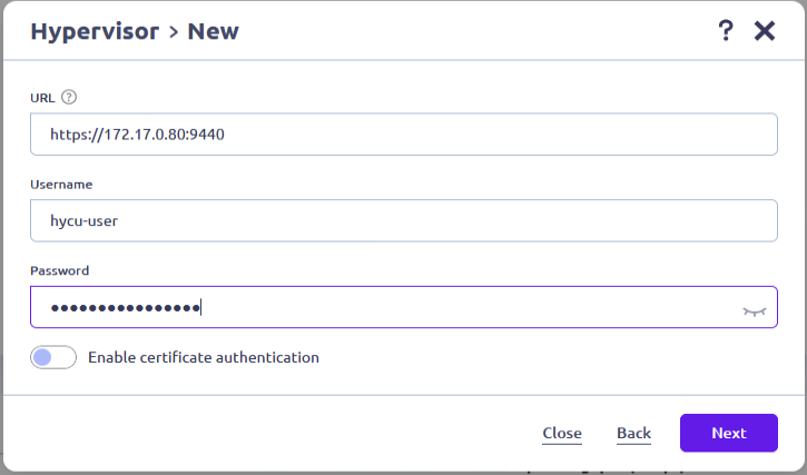 For the URL, just use the cluster VIP of the Nutanix cluster. Don’t forget to add port 9440. Otherwise, the Hycu controller is unable to connect.