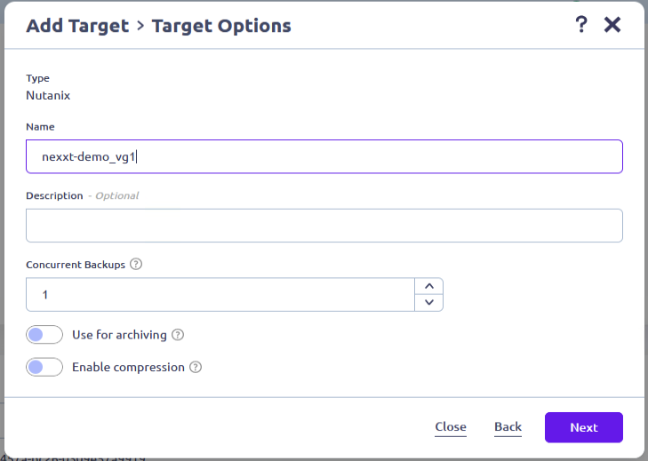 Because a Nutanix target will be a volume group on the cluster, I added _vg1 to the name of the cluster.