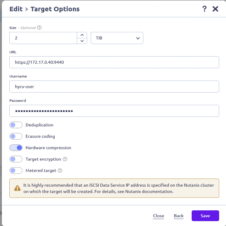 In the second screen for creating a Nutanix target, you can specify the size of the volume group. I recommend to specify the size to make sure your Nutanix cluster cannot run out of space.