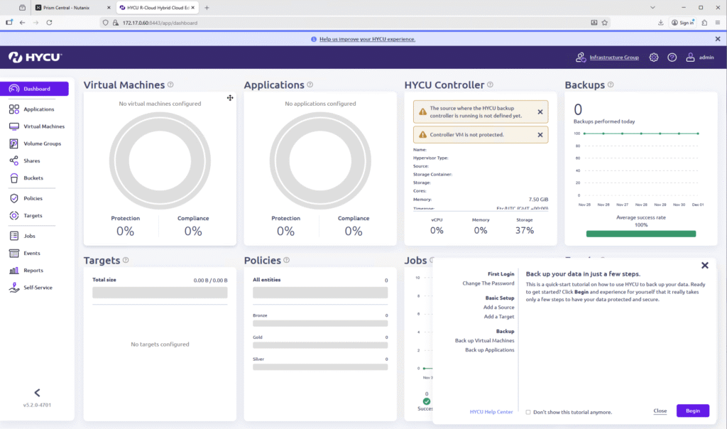 Under the Hycu controller, you immediately see a warning that the Controller is not protected. Another warning indicates that the Nutanix is not yet added as a source.