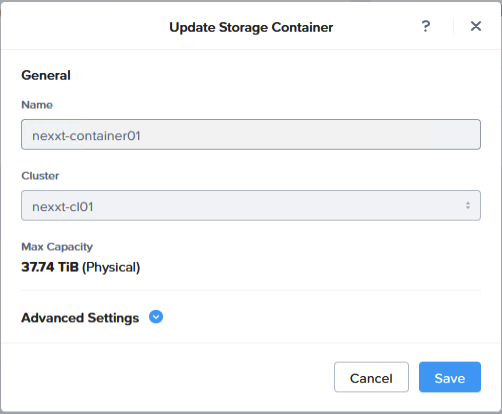 When you are using Prism Central to update the container, you see something like this. The filesystem whitelist is found under the ‘Advanced Settings’.