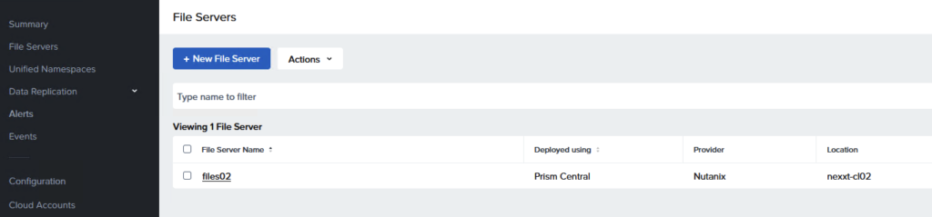 In the dropdown menu, a new option appears. We are able to manage Files from Prism Central from now on.
