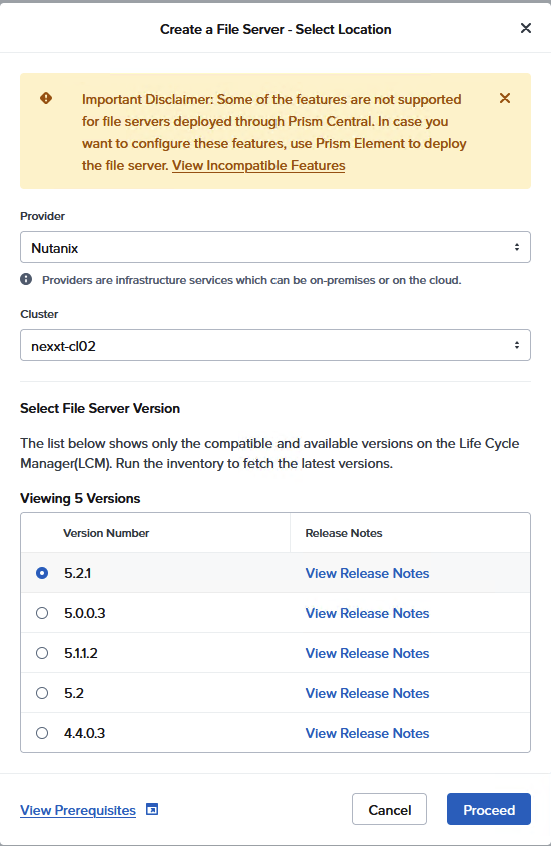 Then select the File Server version. (As mentioned before: if the list is empty, just go to LCM and rerun the inventory of Prism Central.