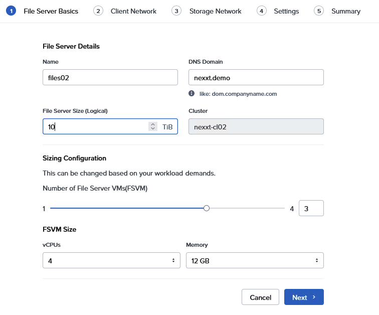 Depending on your workload you can spcify the number of FSVMs and the size of the VMs. (In a later post, I will give some more details about sizing Nutanix Files.)