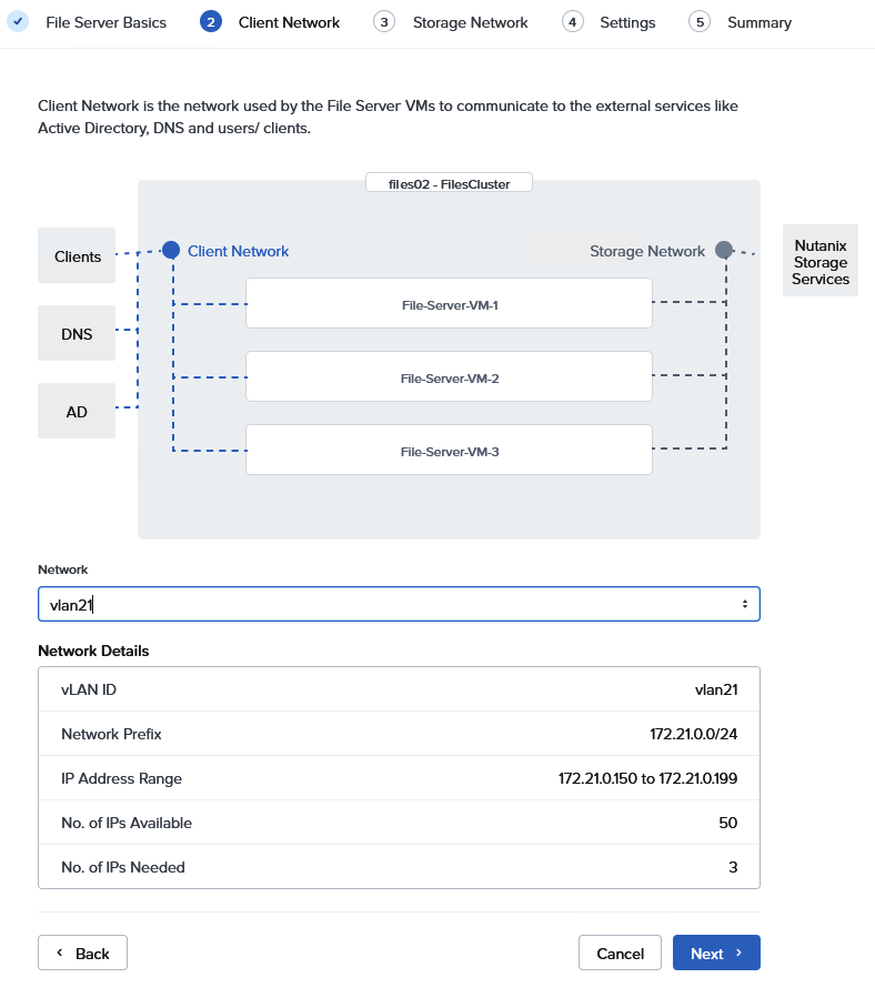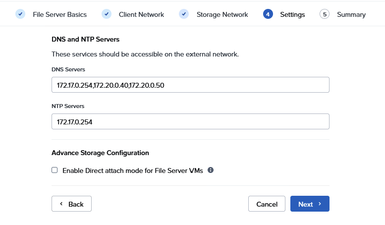 Next page is for the configuration of the storage network. The File Server VM is using this for communication with the Controller VM for the storage.