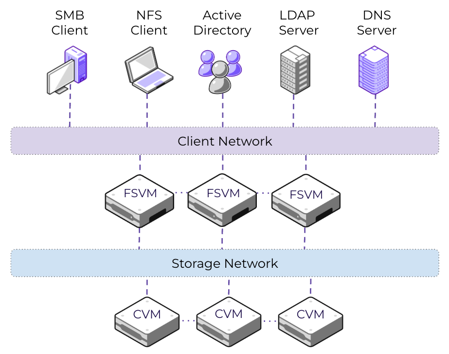 Nutanix Files eliminates the requirement for a third-party file server and uses a scale-out architecture that provides file services to clients through the Server Message Block (SMB) and Network File System (NFS) protocols. A logical file server instance, sometimes referred to as a Files cluster, consists of one or more file server VMs (FSVMs), which encompass shares and exports.